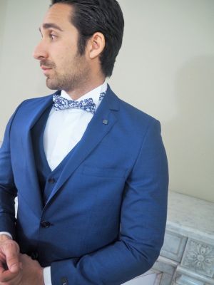 Costume coupe ajustée avec pantalon slim bleu super 120 proposé avec noeud papillon bleu à pois