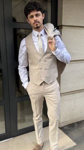 Confectionné dans un mélange de lin respirant, ce costume allie confort, légèreté et tenue impeccable tout au long de la journée. La coupe ajustée met en valeur la silhouette sans compromettre l’aisance, tandis que le gilet assorti apporte une finition raffinée. Porté avec un nœud papillon ou une cravate, il s’adapte aussi bien à un style formel qu’à une allure plus décontractée.