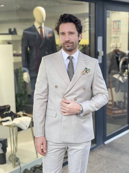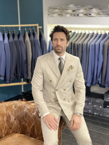 Le costume d'été croisé en beige incarne l'essence de la sophistication estivale.