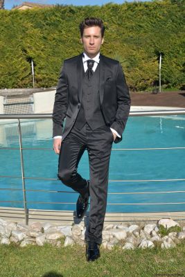 Costume coupe ajustée avec pantalon slim noir satiné proposé avec lavalière et pochette noir brillant et bijoux swarosky
