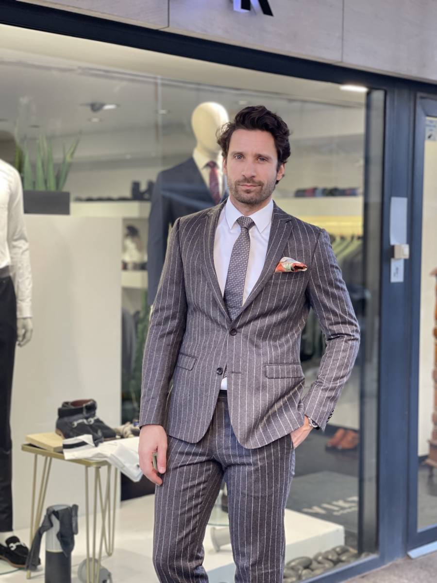La flanelle, douce au toucher, offre un confort exceptionnel, faisant de ce costume un choix idéal pour les journées où le raffinement rencontre la décontraction. La coupe soigneusement ajustée met en valeur la silhouette, tandis que les rayures apportent une note de dynamisme à l'ensemble, évoquant l'élégance sportive d'un dandy contemporain.