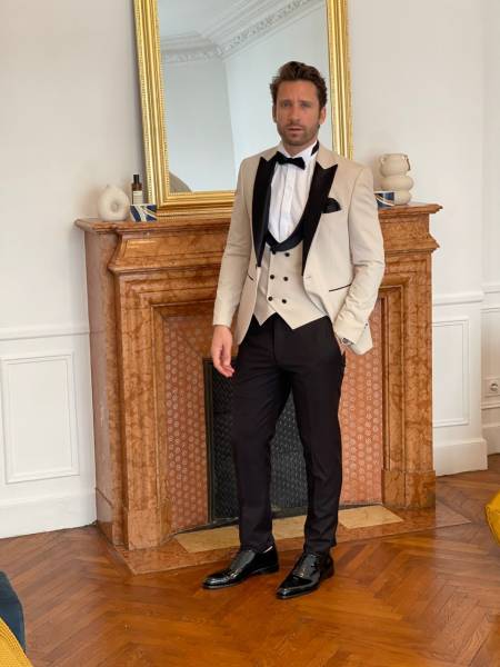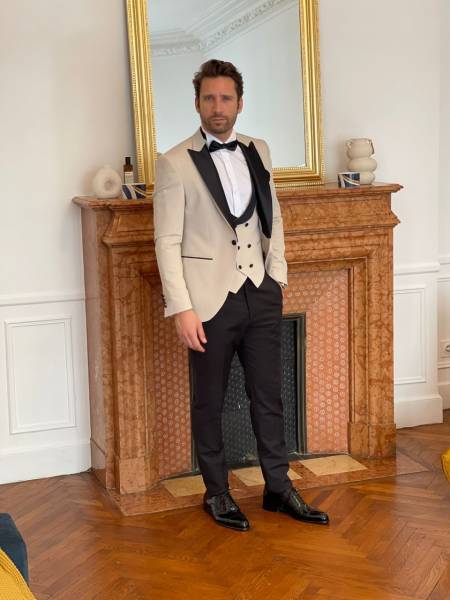 Viktör Concept Homme vous propose de nombreux costumes de Mariage 2024 vous propose son smoking blanc cassé revers noir en soie col pointe.